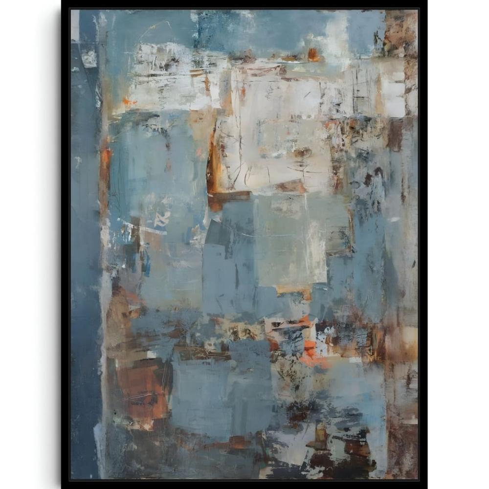تتسم هذه اللوحة بتدرجات الألوان الهادئة، حيث تتداخل درجات الأزرق مع لمسات من البني والبيج. تعكس الأشكال المستطيلة والعشوائية إحساسًا بالتاريخ والعمق، مما يخلق جوًا من التأمل. السطح الخشن والتفاصيل الدقيقة تضيف طبقات من التعقيد، مما يجعل المشاهد يشعر وكأنه يستكشف ذكريات بعيدة. هذه القطعة الفنية تدعو للتفكير في الزمن وتغيراته، وتقدم تجربة بصرية غنية ومؤثرة.
